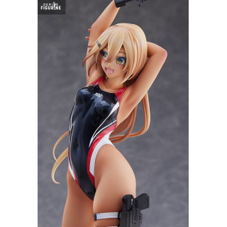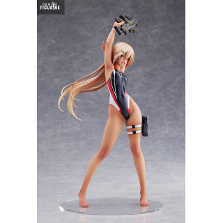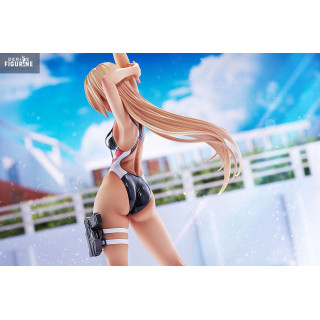 Arborant un maillot de bain de compétition noir rehaussé de bandes rouges et blanches, elle rompt avec l’innocence que l’on pourrait attendre d’un tel design en brandissant une mitraillette dans une main, prête à faire feu. Son autre jambe est équipée d’un holster contenant une arme secondaire, clin d’œil assumé à l’esthétique des combattantes modernes façon "spy action girl". Ses longs cheveux blonds flottent avec naturel dans son élan, donnant de la fluidité à l’ensemble de la composition.