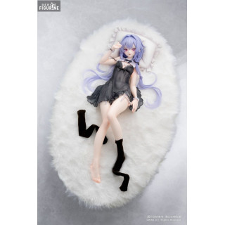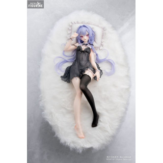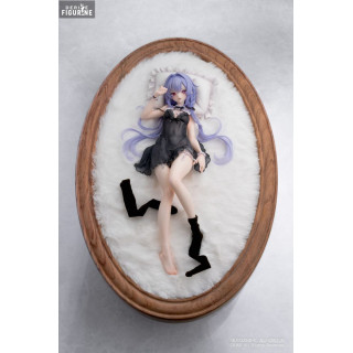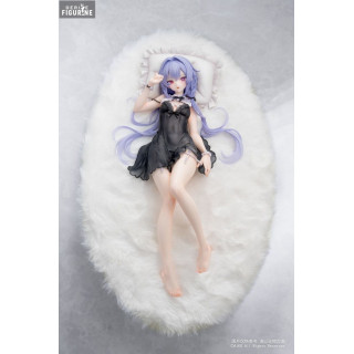 Dans cette version Hidden Forest, Niya est représentée dans une pose allongée empreinte de sérénité, vêtue d’une élégante nuisette noire qui souligne son charme raffiné. Ses longs cheveux lavande tombent en cascade autour d’elle, ajoutant une touche éthérée à l’ensemble. Les détails subtils de son expression, comme son léger sourire et son regard perçant, capturent une atmosphère intime et onirique. La pose de Niya sur un coussin blanc moelleux, entourée d'un décor texturé rappelant un cocon naturel, renforce l’impression d’un moment volé dans un havre de tranquillité.