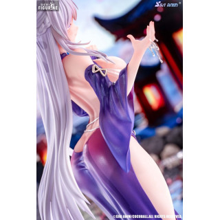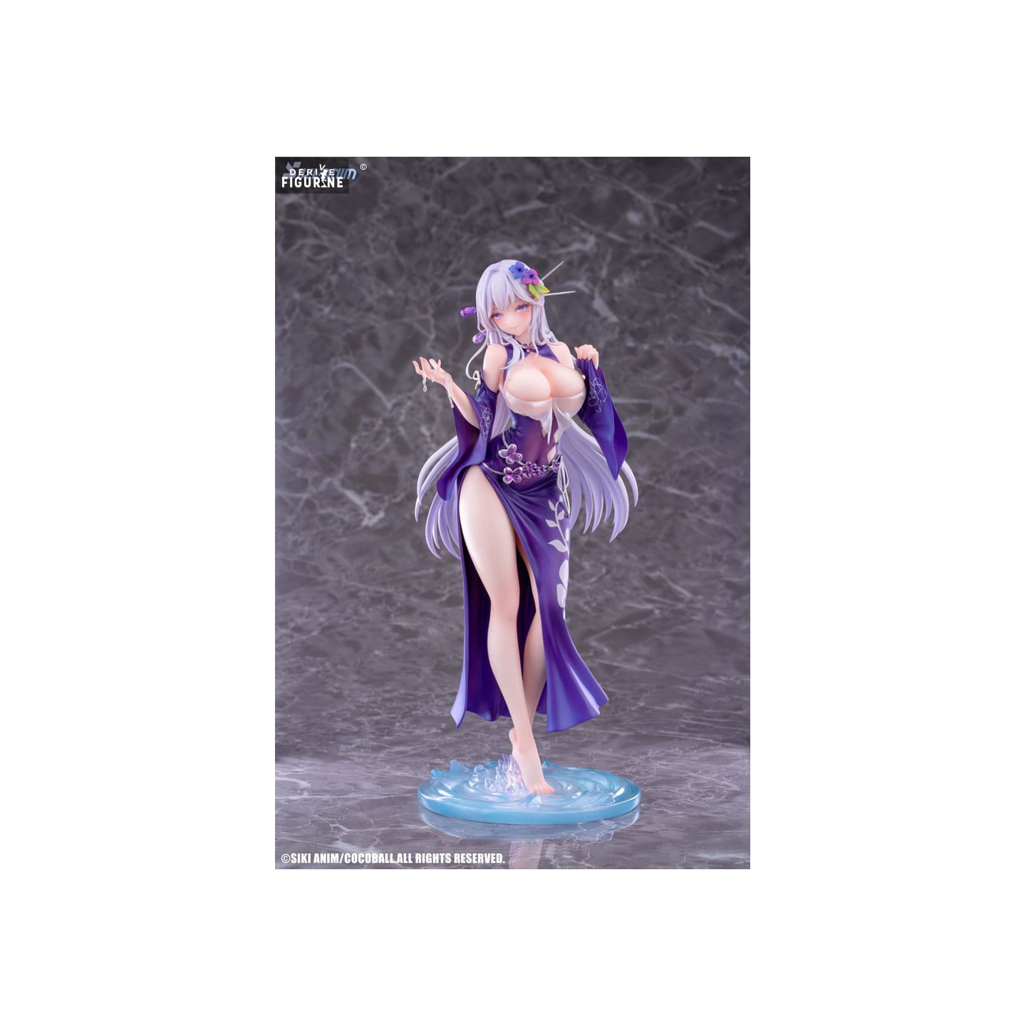 Le personnage est représenté dans une posture gracieuse, vêtu d’un kimono violet orné de motifs floraux délicats. Sa longue chevelure argentée s’écoule harmonieusement, accentuant sa présence presque éthérée. Le socle, illustrant un effet d’eau cristalline, complète l’ambiance aquatique et renforce le thème mystique de cette création. Ses accessoires subtils, comme une fleur élégante dans ses cheveux et une chaîne délicate, ajoutent une touche supplémentaire de sophistication.