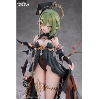 L’élégance du personnage est accentuée par la richesse de sa tenue : longue robe académique verte foncée entrouverte, ornée de nœuds bruns, de dorures raffinées, de chaînes et de sceaux alchimiques suspendus. Son monocle doré, sa coiffe carrée stylisée, ainsi que la balance et la fiole qui l’accompagnent rappellent son rôle de scientifique de l’ésotérisme. L’un de ses bas est remplacé par un ornement doré en forme d’étoile et son socle est illustré d’un cercle d’invocation, renforçant la thématique magique.