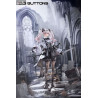 Du haut de ses talons, Ruka manie deux sabres fixés à sa ceinture, tandis que sa main droite tient une lanterne à l’éclat énigmatique. Sa chevelure rose pâle en couettes est ornée de croix noires et de rubans assortis, accentuant son style entre douceur et danger. Son corset structuré, ses manches bouffantes et ses collants imprimés complètent une silhouette puissante et raffinée.