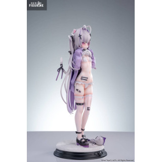 Cette figurine mesure environ 27 cm, à l’échelle 1/6, et met en valeur Shubii dans une posture frontale tout en timidité maîtrisée. Elle cache à moitié son visage avec les manches de sa veste violette tombant mollement, alors que sa tenue minimaliste laisse peu de place à l’imagination. Le travail sur les dégradés de couleur, les reflets sur les cheveux lavande, et les petits détails comme les pattes de chat sur les chaussures est vraiment soigné. Même le socle marbré apporte une finition élégante à l’ensemble.