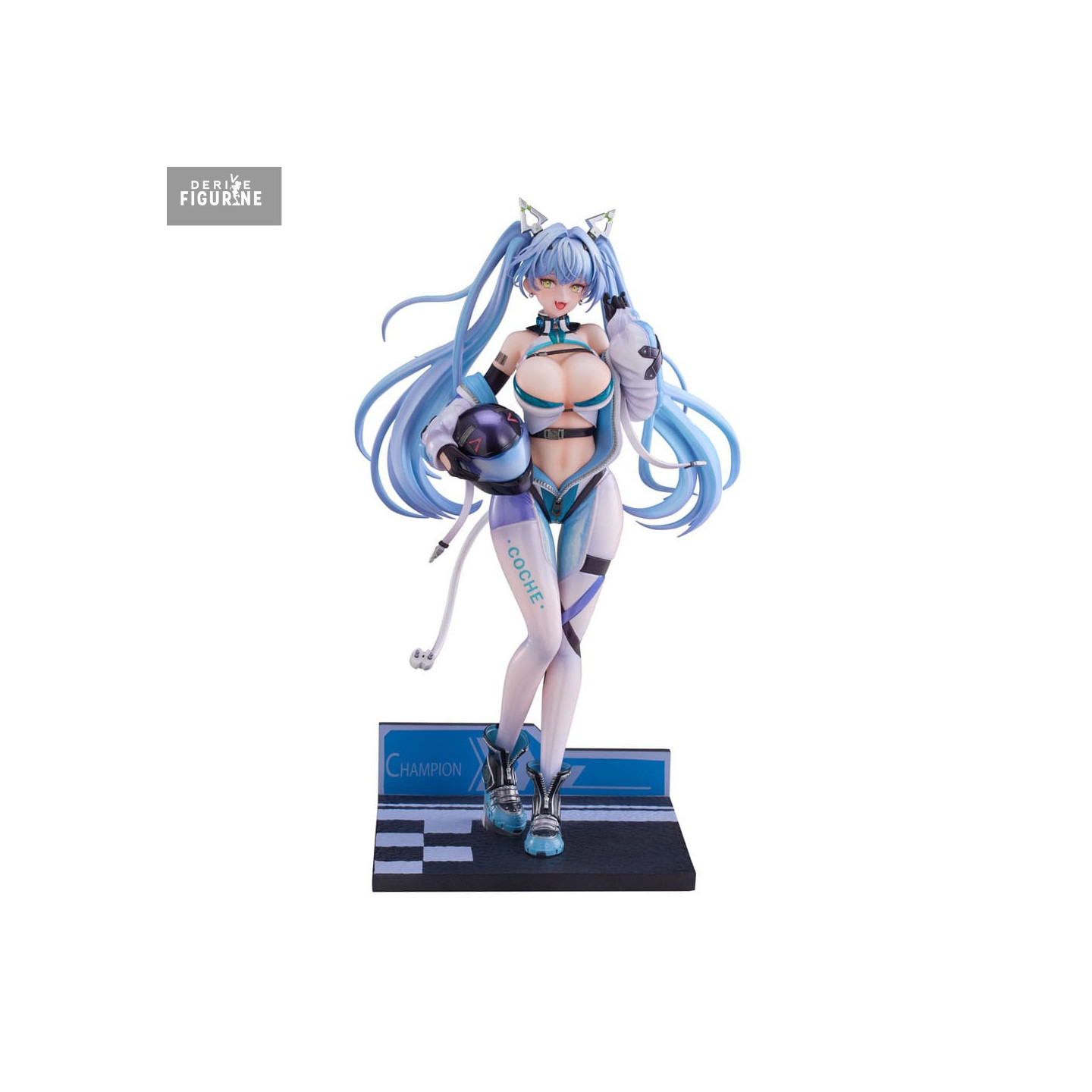 La pose confiante, le casque à la main, les oreilles félines et les longues couettes bleues donnent un look à la fois dynamique et craquant. La combinaison moulante bleu et violet métallisé met en valeur sa silhouette tout en ajoutant des détails techniques (logos, zips, textures). Le socle façon ligne d’arrivée complète la mise en scène.