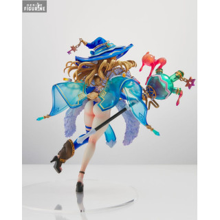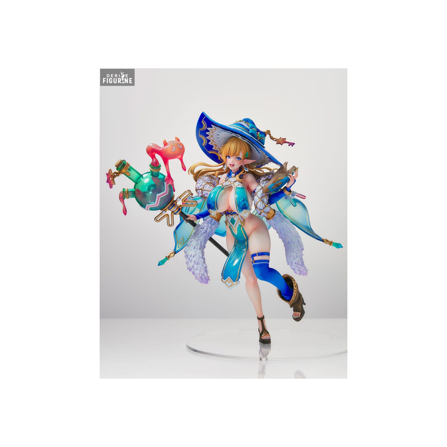 Habillée d’une tenue bleue éclatante qui mêle armure légère et touches sexy, Milklinde est capturée en pleine action : d’un côté, elle brandit son sceptre orné d’un flacon magique d’où s’échappe une étrange créature gluante, de l’autre, elle tient un grimoire ouvert, prête à lancer un sort. Son large chapeau de sorcière, ses oreilles effilées et ses ailes d’épaules finement sculptées renforcent son côté fantastique, tandis que sa posture dynamique donne beaucoup d’énergie à l’ensemble.
