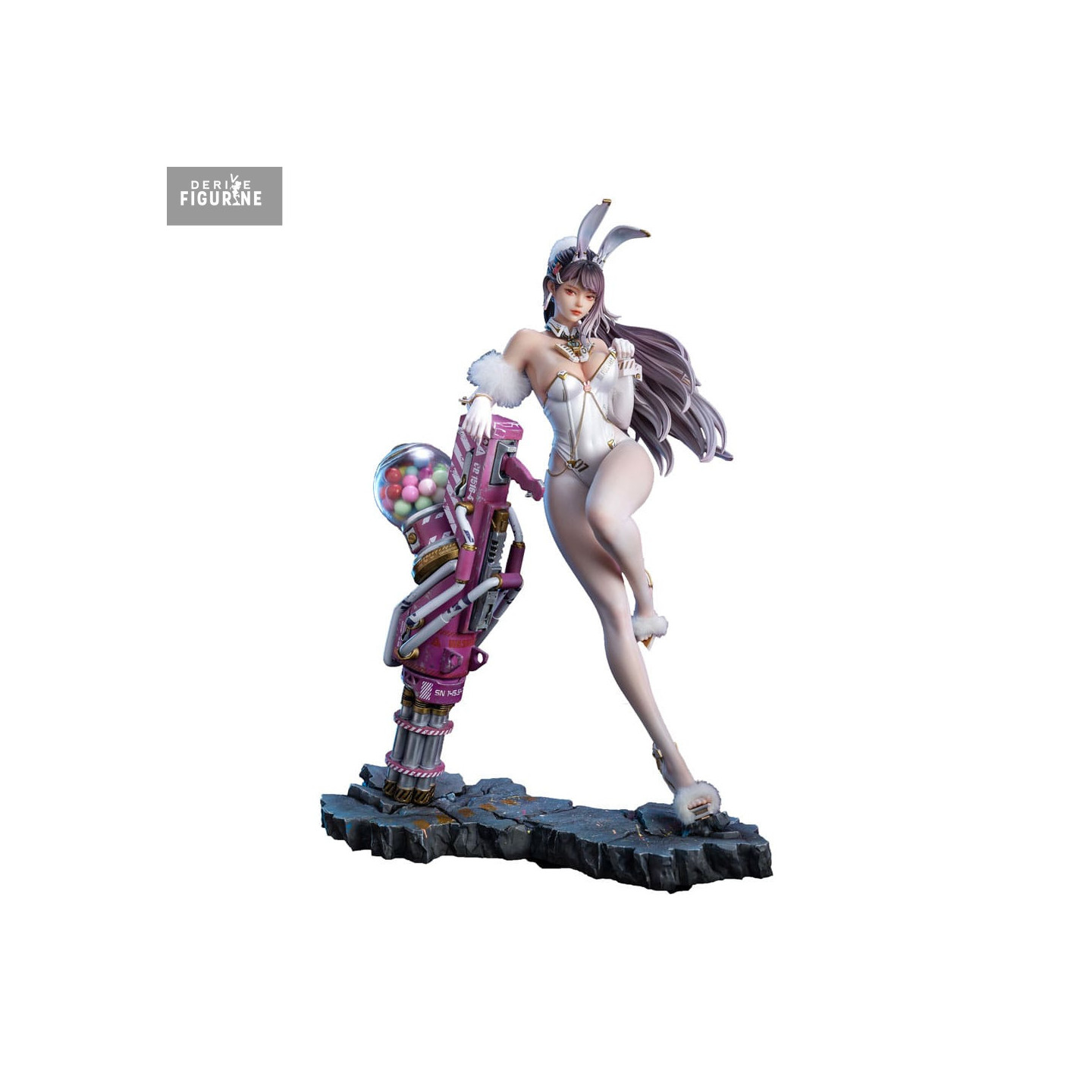 Mais cette lapine cyber-glam ne se contente pas d’un simple costume chic. Elle est équipée d’un imposant canon rose bonbon, sorte de distributeur de chewing-gums géant monté sur support mécanique. Le contraste entre son allure raffinée et la folie douce de cet accessoire donne tout son charme à cette statuette. On pourrait croire qu'elle sort tout droit d’un jeu vidéo déjanté ou d’un film d’animation SF au ton satirique. Sa chevelure mauve en cascade, ses collants discrets et ses talons hauts garnis de fourrure renforcent son style unique, entre pin-up futuriste et héroïne post-apocalyptique.