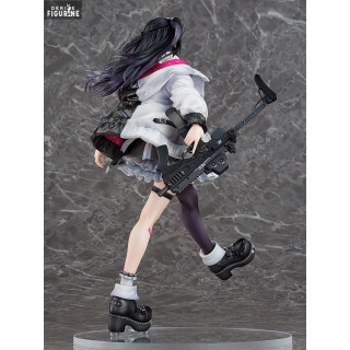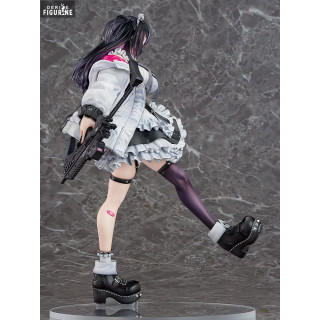 La figurine la montre en mouvement, jambe levée et regard déterminé. Elle porte une robe de soubrette classique avec de multiples volants, rehaussée d’un harnais noir et d’une veste oversize blanche à doublure rose vif. Son masque noir, ses cheveux aux mèches fuchsia et sa mitraillette moderne donnent le ton. Le contraste est renforcé par ses collants asymétriques — un noir opaque, l’autre nu — marqués de pansements colorés, pour une touche kawaii-tech parfaitement assumée.