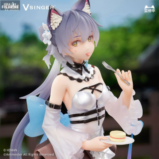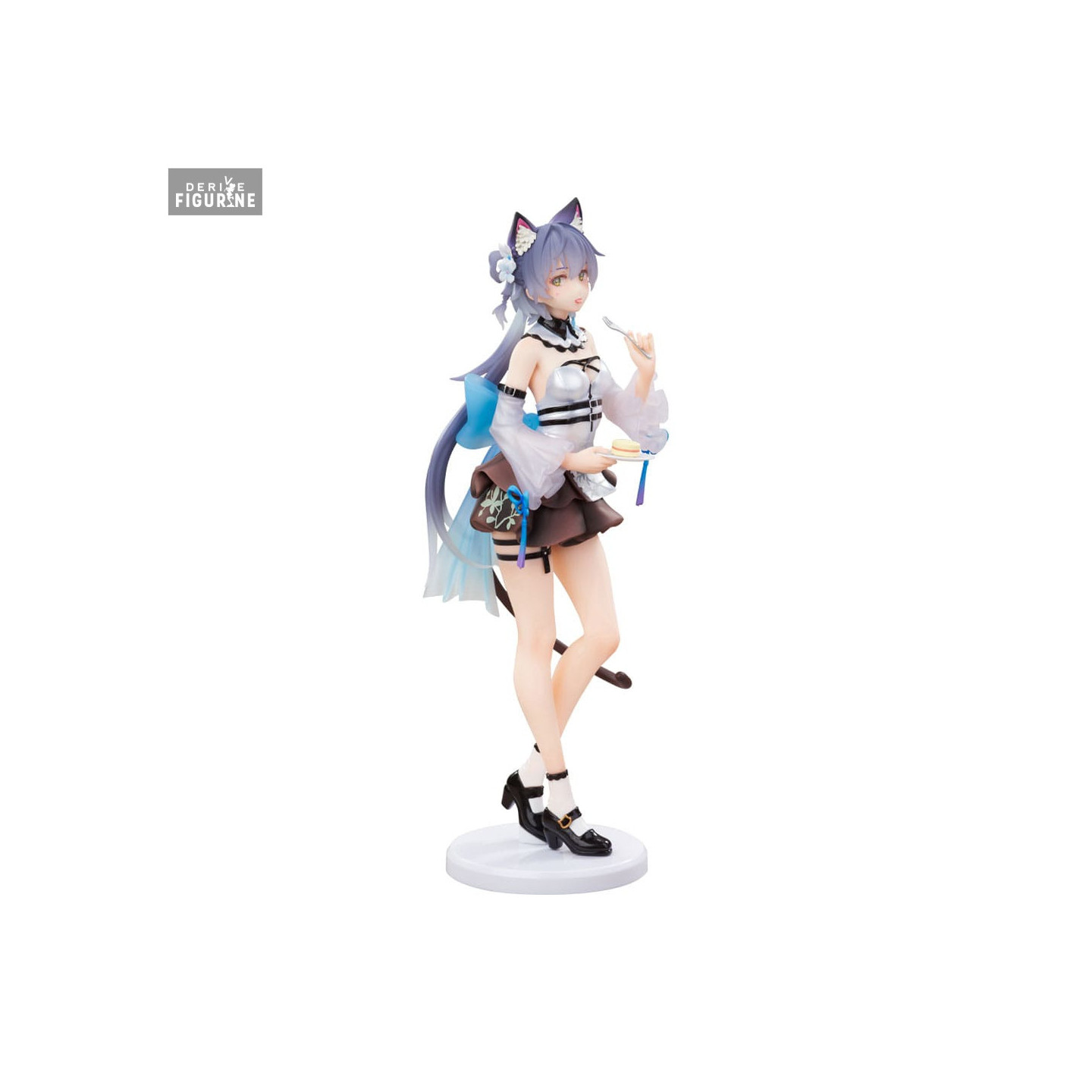 La figurine se distingue par ses longs cheveux dégradés du bleu au violet, ornés de fleurs et de rubans, ainsi que par ses oreilles de chat finement détaillées. Sa tenue mêle un corset blanc satiné, des manches bouffantes transparentes, une jupe courte brune à motifs floraux, et un large nœud bleu dans le dos. Ses chaussures noires vernies avec chaussettes blanches ajoutent une note rétro, tandis qu’elle tient dans ses mains une assiette avec un macaron et une petite fourchette.