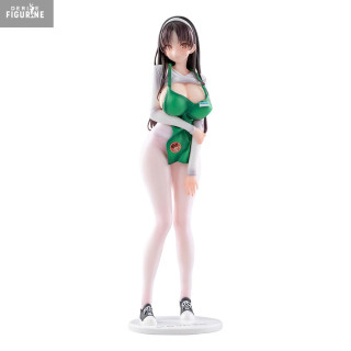 Visuellement, Mari porte une tenue mi-professionnelle mi-décontractée : une combinaison blanche translucide sous un tablier vert vif floqué d’un logo circulaire rouge. Son bandeau noir retient une longue chevelure brune parfaitement lissée. Des baskets noires et blanches viennent casser le formalisme de la scène, renforçant l’impression d’authenticité. Le socle blanc, sobre, complète l’ensemble sans détourner l’attention.