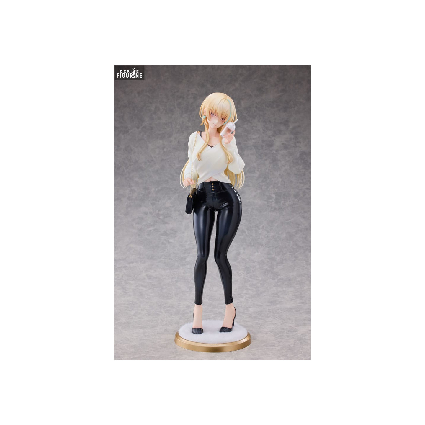 La sculpture rend hommage aux textures contrastées : le tissu fluide de son haut, la brillance de son pantalon effet cuir et la finesse des cheveux blonds soigneusement détaillés. Le socle circulaire à effet moelleux vient compléter cette mise en scène en ajoutant une touche de raffinement à l’ensemble.