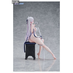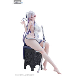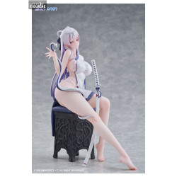 La figurine la représente assise de biais, légèrement cambrée, une main levée dans un geste fluide. Elle porte un qipao blanc nacré fendu sur les côtés, orné de détails violets et d’attaches décoratives. Sa peau claire contraste avec la texture sombre du fauteuil sur lequel elle est posée, finement sculpté avec des motifs sinueux. Son katana, au fourreau blanc, repose nonchalamment contre sa jambe.
