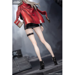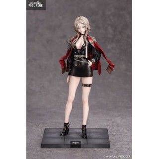 La figurine reprend fidèlement les traits de l’illustration originale : longue veste rouge jetée sur les épaules, mini-robe noire vernie à fermeture croisée, ceinture à boucle métallique, bottines à talons détaillées, et harnais noir sur la cuisse gauche. Sa chevelure blonde, coupée au carré, ondule légèrement pour souligner le mouvement.