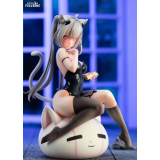 Le socle en forme de gros chat rond et souriant ajoute une touche humoristique et décalée, qui contrebalance l’allure sensuelle du personnage. Les finitions mettent en valeur les textures contrastées entre le corset brillant, les bas mats et les mèches de cheveux finement sculptées.