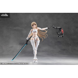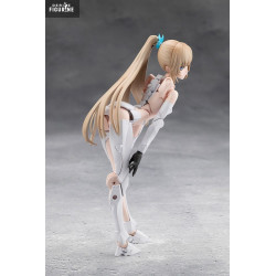 Son design se compose d’une armure blanche minimaliste aux lignes nettes, ponctuée de jointures articulées et de détails mécaniques subtils. La grande épée noire à tranchant bleu électrique vient souligner le contraste visuel et la modernité du personnage. Tout dans cette figurine exprime contrôle, efficacité et élégance technologique.