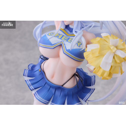 La figurine présente Shion dans un ensemble de pom-pom girl bleu et blanc très court, qui met en valeur sa silhouette généreuse. Son haut mini dévoile largement sa poitrine, tandis que la jupe à volants flotte dans le mouvement. Elle porte des chaussettes montantes rayées et des baskets assorties, ancrée sur un socle circulaire décoré, dans un équilibre parfait sur une jambe.