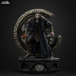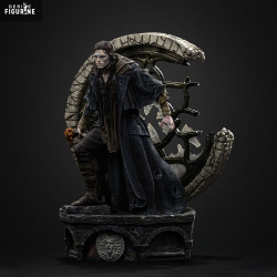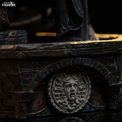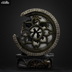 L’arrière-plan est dominé par une arche en ruine en forme de croissant, sculptée de symboles et d’engrenages, donnant à la scène une aura de mystère ancien. Le socle est richement texturé, orné d’un blason central et de motifs architecturaux typiques des univers fantastiques chers à Del Toro.