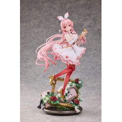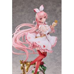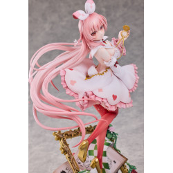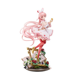 La figurine, richement composée, la présente en suspension au-dessus d’un socle décoré d’un cadre doré, de roses, de livres ouverts et de carreaux évoquant un damier. Elle porte une robe blanche aux détails roses et motifs de cœurs, des bas rouges et des escarpins dorés. Ses longs cheveux roses flottent derrière elle, et elle tient dans la main une baguette dorée rappelant un accessoire magique. Son expression douce, combinée aux oreilles de lapin et au nœud assorti, renforce son aura féerique.
