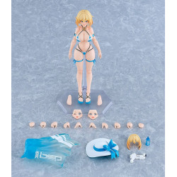 Sur la figurine, on retrouve Sophia dans un maillot de bain bleu clair orné de fines lanières. Elle a des cheveux blonds courts avec une frange légèrement ébouriffée. Le sculpte montre une silhouette fine et élancée, fidèle au style stylisé des personnages Figma. Le set inclut plusieurs visages interchangeables (dont un plus expressif et un plus neutre), de nombreuses paires de mains aux positions variées, une chevelure alternative, un grand chapeau blanc décoré d’un ruban bleu, un drap ou voile translucide, ainsi qu’un petit accessoire bleu et un support transparent pour la mise en pose.