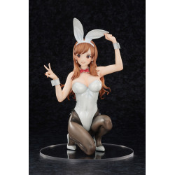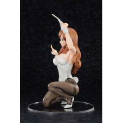 Visuellement, Umeka porte une tenue de bunny blanche composée d’un bustier brillant parfaitement ajusté, associé à un nœud papillon rouge au cou et à des manchettes blanches aux poignets. Ses longues jambes sont habillées de collants noirs semi-transparents qui se fondent dans des escarpins blancs à talons hauts, ce qui allonge encore la silhouette. Elle a de longs cheveux châtain clair légèrement ondulés qui tombent sur ses épaules, surmontés d’un serre-tête à grandes oreilles de lapin blanches. L’ensemble repose sur un socle rond transparent qui reste discret et met l’accent sur la figurine elle-même lorsqu’elle est exposée.