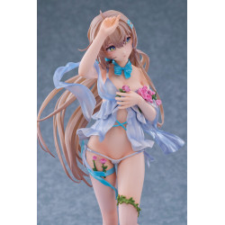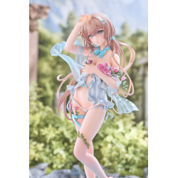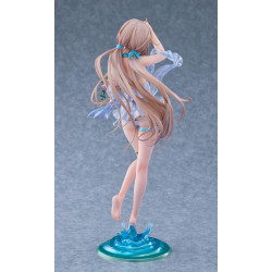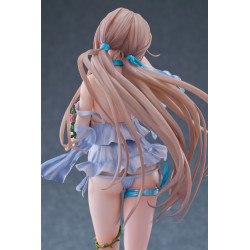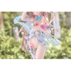 La tenue joue beaucoup sur les voiles et la transparence : Momoko porte un haut bleu très léger, ouvert et flottant autour de son buste, retenu par un large nœud au niveau du cou. Sous ce tissu, on aperçoit un maillot dans les mêmes tons pastels, que l’on retrouve sur le bas décoré de motifs floraux et de petits rubans bleus. Des lianes et feuilles vertes courent le long de sa hanche et de sa cuisse, comme si la nature venait l’enlacer. Ses longs cheveux châtain clair ondulent dans son dos et autour d’elle, agrémentés d’une barrette bleue. Elle est debout sur un socle circulaire représentant une éclaboussure d’eau bleu turquoise, partiellement transparente, qui apporte une touche fraîche et permet de l’exposer facilement au centre d’une collection.
