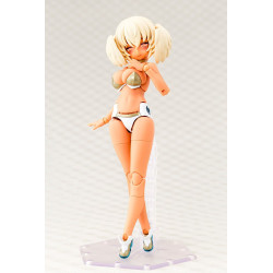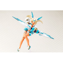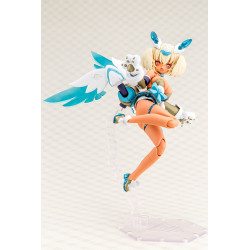 Visuellement, la figurine se distingue par sa peau mate et ses cheveux blonds coupés au carré, avec quelques mèches plus longues. Elle porte un serre-tête avec de grandes oreilles bleu turquoise à la façon d’un animal ou d’un “bunny mecha”, et un masque assorti sur le front. Sa tenue se compose d’un ensemble très court bleu et blanc, agrémenté de petites pièces d’armure et de lanières. À l’arrière, de grands éléments en forme d’ailes ou de lames stylisées s’étirent depuis le dos et les hanches, renforçant le côté mécanique. Ses chaussures bleu métallisé complètent le tout. Grâce au corps articulé de type model kit, tu peux ajuster l’angle des jambes, des bras et des pièces arrière pour lui donner une vraie présence sur ton présentoir.
