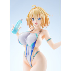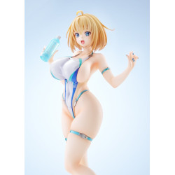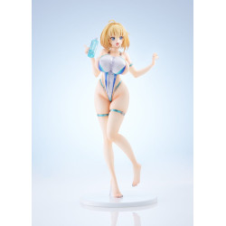 On la voit debout, le corps légèrement tourné, une jambe en appui et l’autre relevée, pieds nus. Elle porte un maillot blanc très échancré, marqué par des motifs et découpes bleu turquoise qui remontent sur le buste, avec des lanières assorties autour des bras et des cuisses. Ses cheveux blonds sont coupés en carré avec une frange, et son visage affiche une bouche entrouverte, comme un sourire en plein mouvement. Elle tient une bouteille/translucide bleu clair dans une main, et l’ensemble est présenté sur un socle transparent qui aide à garder la pose bien en place.