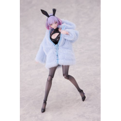 Visuellement, le set contient une veste bleu clair à capuche, avec un aspect duveteux et une fermeture éclair au centre. À côté, tu as un accessoire noir de petite taille, et plusieurs petites pièces couleur chair avec l’extrémité noire, présentées en paires. Une fois monté sur la figurine, ça donne tout de suite un look plus “détente” sans prendre de place en vitrine.