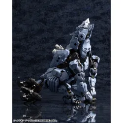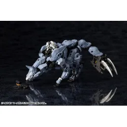 Visuellement, on voit un mecha quadrupède au blindage bleu-gris avec des éléments gris foncé aux articulations et dans la structure interne. La tête reprend une forme de museau et de crâne de loup, très anguleuse, et le dos est chargé de plaques et de volumes mécaniques, comme un pack d’équipement intégré. Sur le flanc, un gros module d’arme est fixé, terminé par une pièce sombre à l’avant qui mélange griffes et cannon compact, donnant l’impression d’un outil de capture ou d’attaque rapprochée. Les pattes sont épaisses, segmentées, avec des appuis fins qui renforcent l’allure “bête mécanique”, et un petit pilote en blanc est visible sur le dessus, assis/arrimé comme sur une selle technique. Une fois posé sur ses quatre appuis, il se lit très bien en vitrine, avec une silhouette horizontale qui prend de la place sans être fragile.