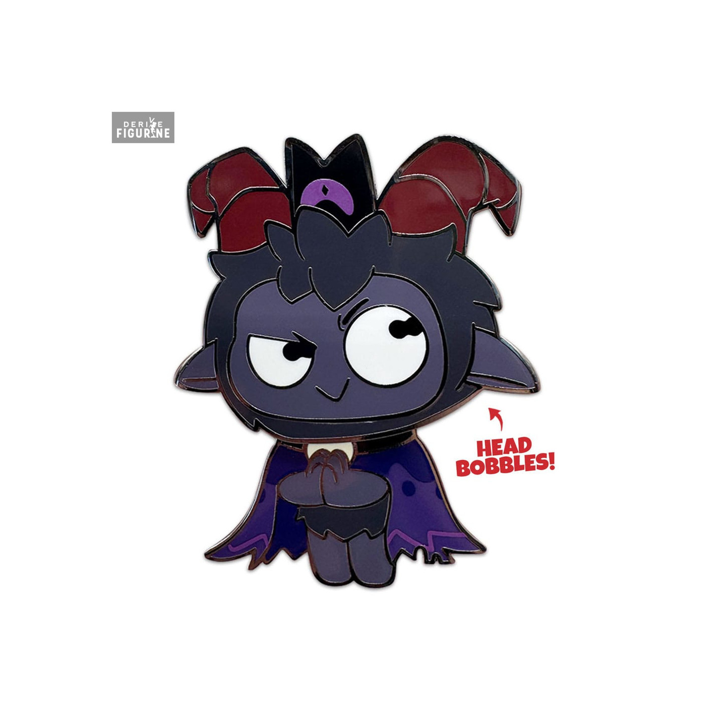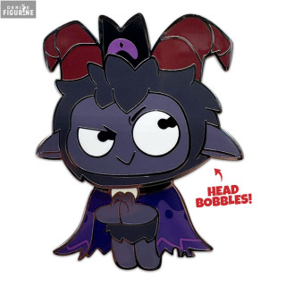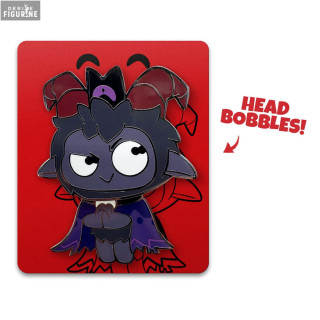 Ce pin restitue fidèlement son design unique : une silhouette cornu en émail gris anthracite, un manteau pourpre aux reflets violets et un petit diadème noir orné du symbole occulte. Les yeux légèrement écarquillés et son expression malicieuse sont soulignés par un contour métal noir, tandis que la tête montée sur ressort assure un effet jiggle à chaque mouvement.