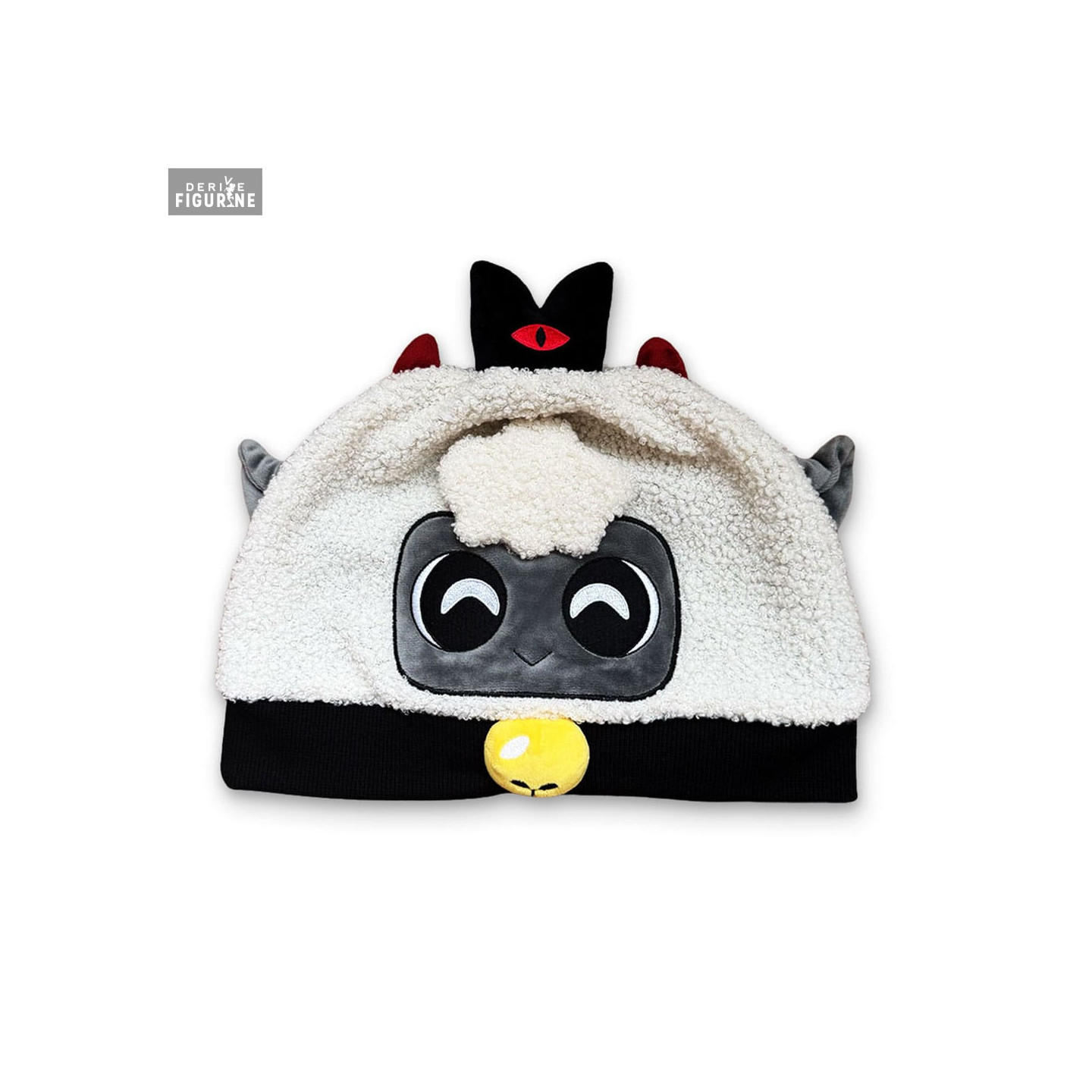 Le design reprend fidèlement les traits de Lamb : grands yeux clos brodés dans un velours doux, petites cornes rouges et toison blanche en relief. Au sommet, la couronne noire à l’œil pourpre et le grelot jaune appliqué évoquent l’emblème occulte du jeu, pour un rendu à la fois ludique et atmosphérique.