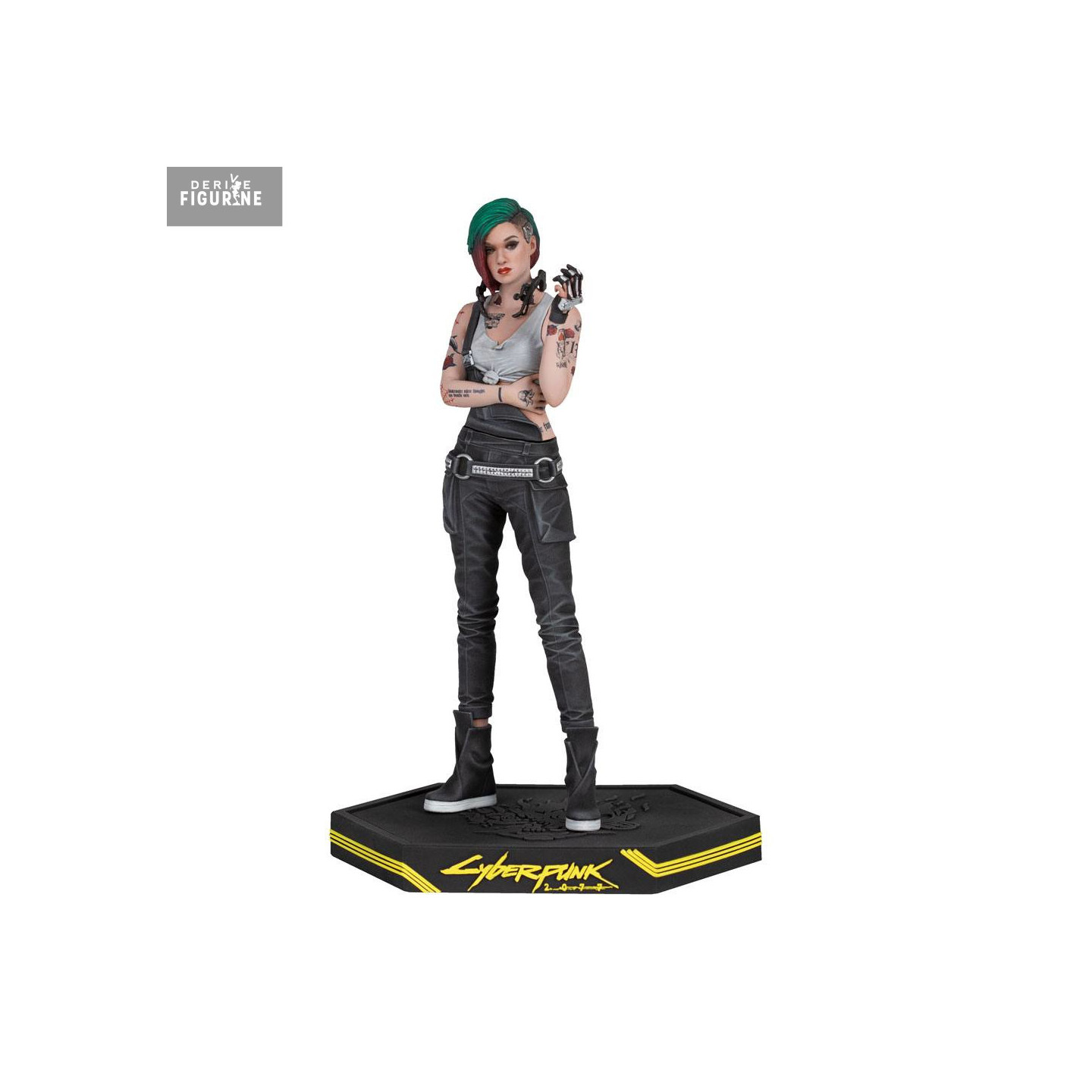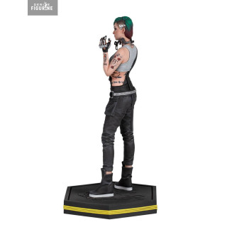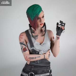 La figurine la représente dans une posture droite, bras croisés, avec une expression calme mais lucide. Chaque détail visuel est fidèle à son design in-game : cheveux rasés d’un côté et teints en vert et rose, tatouages visibles sur les bras, piercing, débardeur gris ajusté et pantalon noir à chaînes et poches cargo. Elle tient dans une main un outil de modification neural, clin d’œil à son métier.