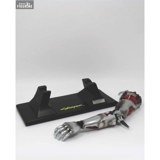 Réplique détaillée de l'arm Silverhand de "Cyberpunk 2077", avec socle de présentation