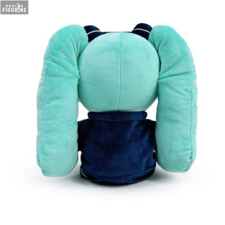 Cette peluche capture fidèlement son apparence, avec ses longs cheveux vert menthe attachés en deux couettes volumineuses, ses grands yeux aux iris rouges cerclés de jaune et son expression vive. Elle porte une veste bleu foncé aux détails brodés, assortie à un pantalon de la même teinte, ainsi qu’un col rose orné d’un motif discret. Les finitions cousues mettent en valeur ses traits stylisés et l’esprit unique du personnage.