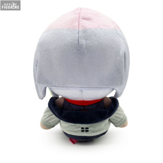La peluche reproduit fidèlement son apparence, avec sa chevelure pastel aux teintes dégradées de blanc, rose, violet et vert clair, tombant en mèches droites sur son visage. Ses yeux verts au contour noir sont brodés avec soin, exprimant à la fois assurance et mystère. Elle porte une tenue sombre avec des détails rouges et gris, rappelant son look iconique de la série.