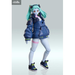 La figurine reprend à la perfection son apparence : cheveux turquoise, peau bleutée, grands yeux rouges, veste oversize bleu foncé, baskets assorties et ses deux pistolets rose et turquoise. Sa posture décontractée, son regard assuré et ses accessoires fidèles donnent instantanément le ton.