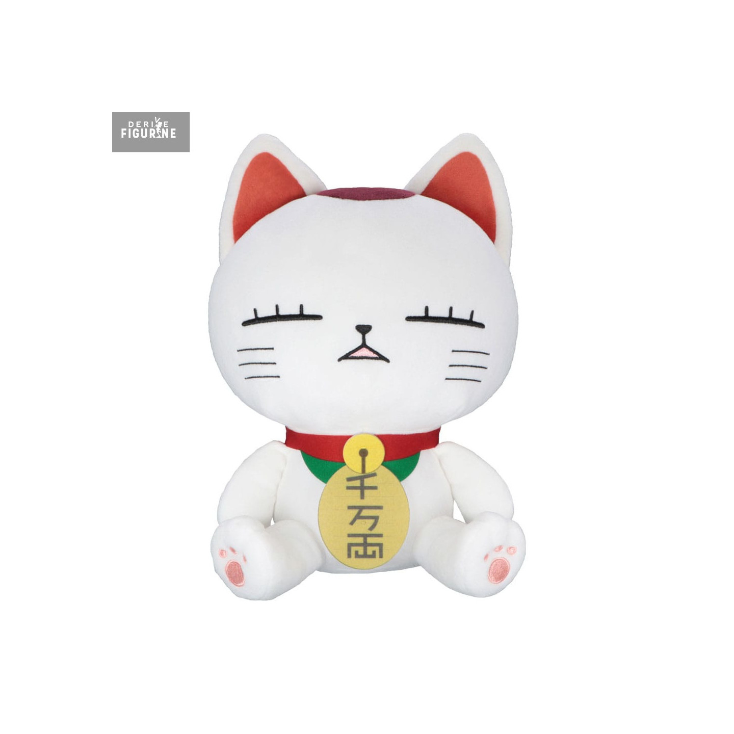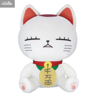 Le design de cette peluche reprend fidèlement les codes du maneki-neko : pelage blanc immaculé en velours doux, visage brodé aux yeux mi-clos et moustaches discrètes, grandes oreilles roses bordées de blanc et col clochette rouge. L’emblématique pièce d’or apposée sur son ventre arbore le kanji « 千両 », gravé avec soin. Sa posture assise, pattes avant légèrement écartées, souligne son élégance minimaliste.