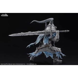 Cette figurine de la collection Q Collection par Art Spirits montre Artorias dans une posture plus contenue, mais tout aussi chargée de tension. Il est là, accroupi, lame gigantesque en arrière, prêt à fondre sur l’ennemi. Sa cape et ses lambeaux de tissu déchirés par le temps flottent légèrement, comme si l’Abysse lui-même respirait autour de lui. L’ensemble est sobre, mais terriblement expressif.