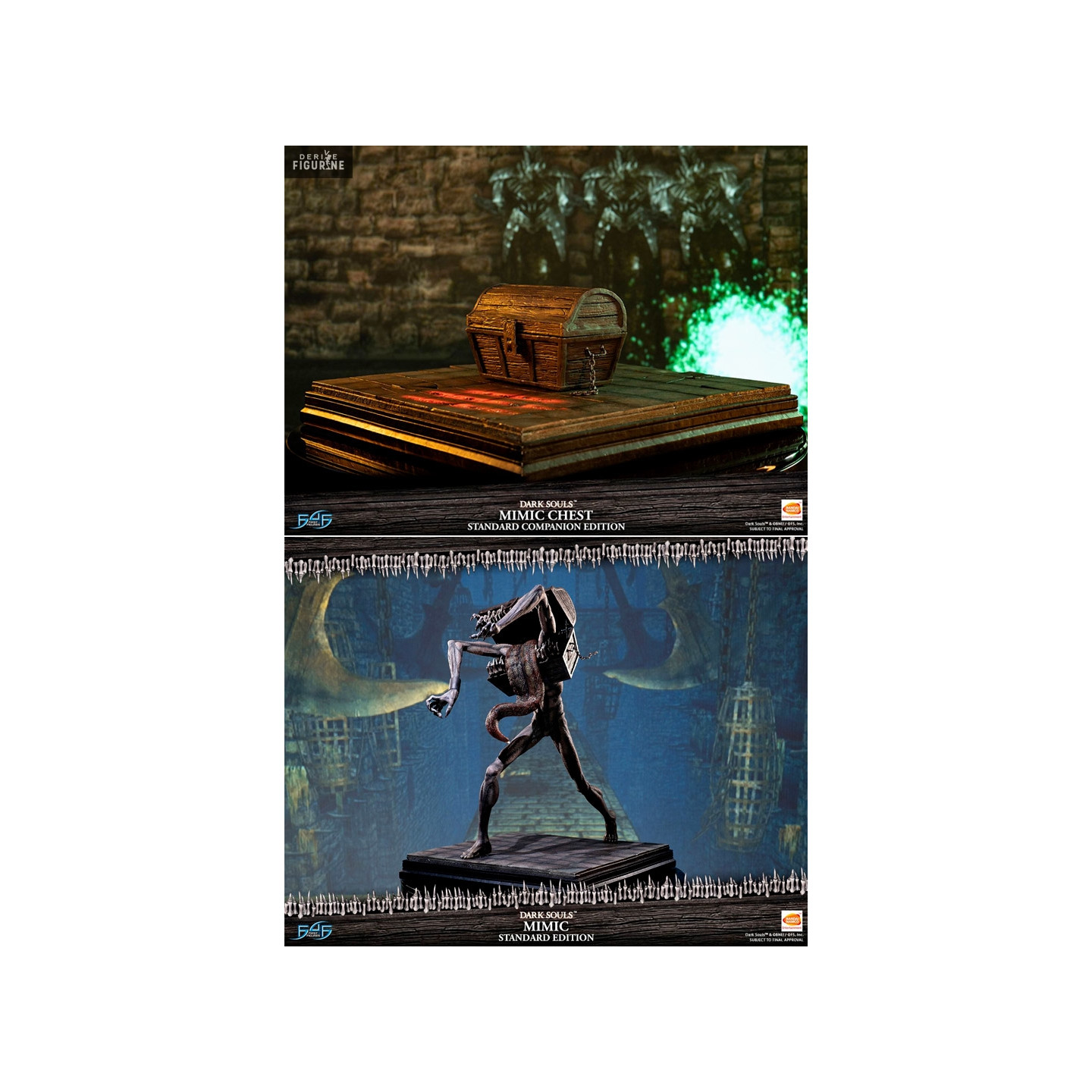 Dans l'univers vidéoludique de Dark Souls, les Mimic ne sont certainement pas vos amis... Effectivement, ils prennent la forme de coffres à trésor et lorsque vous tentez de les ouvrir naïvement, ils vous attaquent... Deux versions sont proposées en figurine, la première est le Mimic Chest où il a donc sa forme de coffre innocent et le second appelé Mimic est donc la forme qu'il prend vous attaquer !
