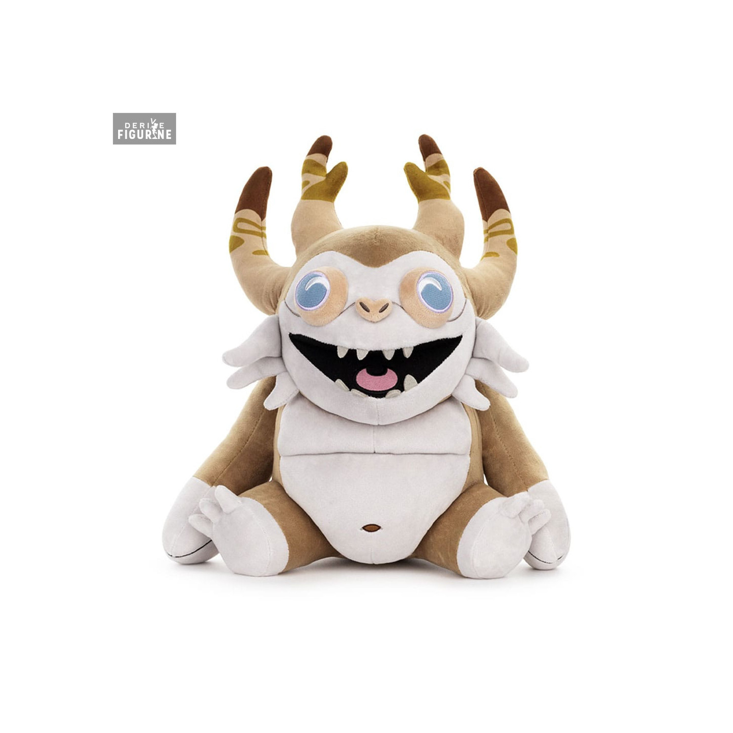 La peluche met en scène un petit monstre marron et beige, assis, avec un ventre rebondi et un large sourire laissant apparaître ses dents pointues. Ses grands yeux ronds à pupilles en spirale lui donnent un air espiègle et un peu hypnotique. Deux grandes cornes ornées de motifs dorés s’élèvent au-dessus de sa tête, renforçant son look unique. Les détails brodés sur le visage et les pattes ajoutent de la profondeur à l’ensemble.