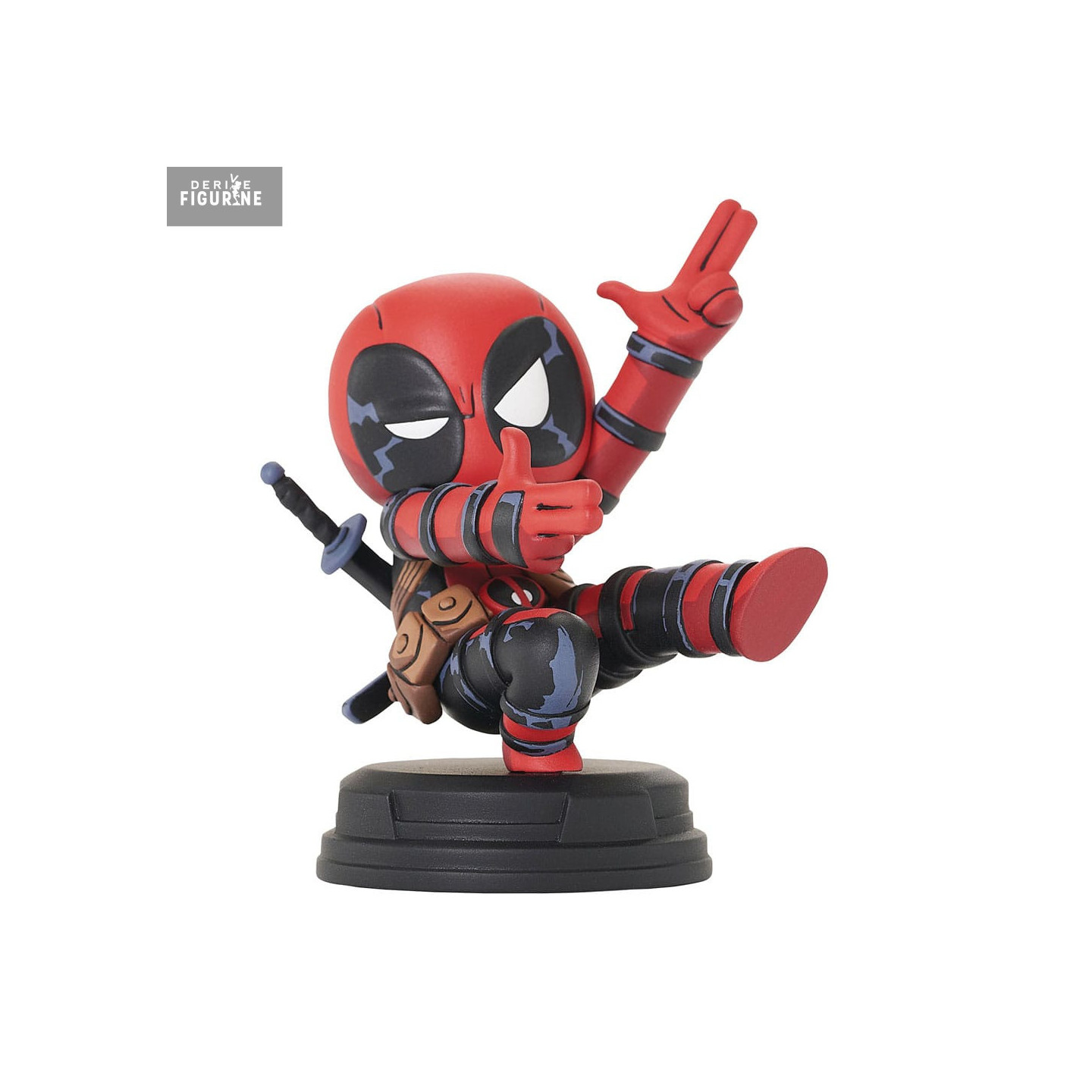 Figurine officielle de Deadpool (Finger Guns) en résine mesurant environ 8 centimètres de haut. Le fabricant est Diamond Select Toys.