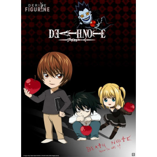 Voici un joli poster de Misa, Light et L. Ils sont dans une forme que l'on appelle chibi, et je ne sais pas vous, mais je les trouve très mignons comme cela. Ils tiennent également une pomme rouge chacun et on notera aussi que Ryuk s'est glissé discrètement sur la photo.