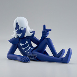 Visuellement, il est représenté allongé, appuyé sur un bras, les jambes étirées devant lui, l’autre main formant un geste de “pistolet” avec l’index pointé. Le corps est d’un bleu foncé uniforme, avec un motif blanc sur le torse qui évoque des lignes et des points, et des épaulières arrondies. Sa tête est couverte d’un masque bleu avec un visage stylisé blanc (sourire et yeux), encadré par des cheveux blancs en mèches épaisses qui tombent de chaque côté. La pose au sol donne une silhouette très facile à poser sur une étagère, surtout près d’un écran ou d’un coin gaming.