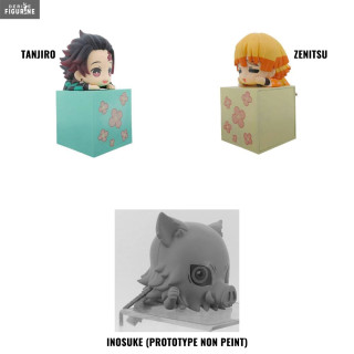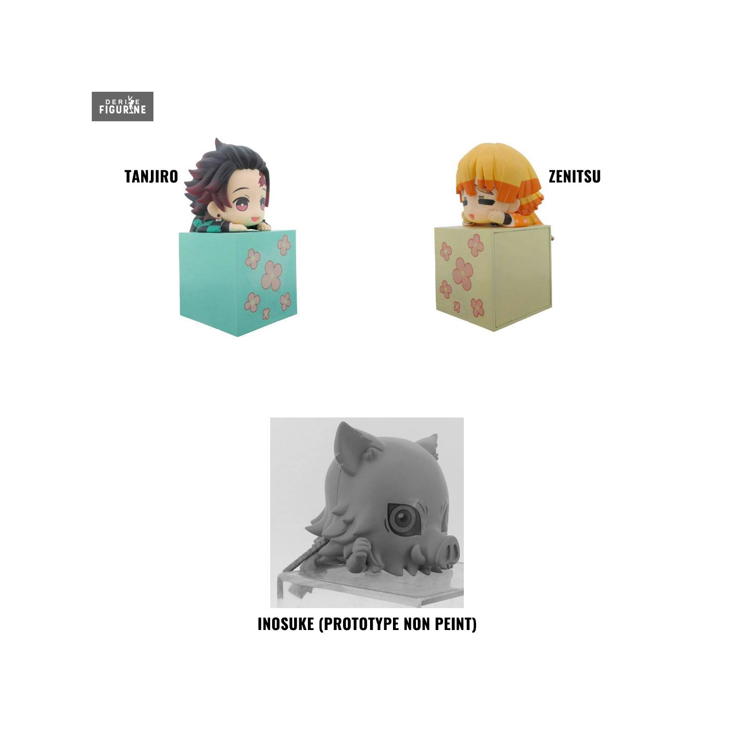 Figurine officielle au choix entre Tanjiro, Zenitsu ou Inosuke en PVC mesurant environ 10 centimètres de haut. Elle est issue de la collection Hikkake. Le fabricant est FuRyu.