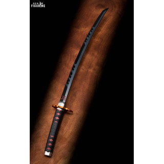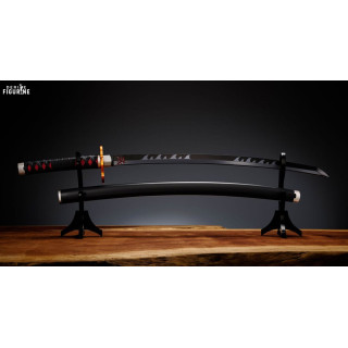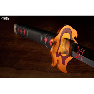Figurine officielle Nichirin Sword (Tanjiro Kamado) Kyojuro Rengoku’s Sword Guard mesurant environ 88 centimètres de long. Elle est issue de la collection Proplica. Le fabricant est Bandai.