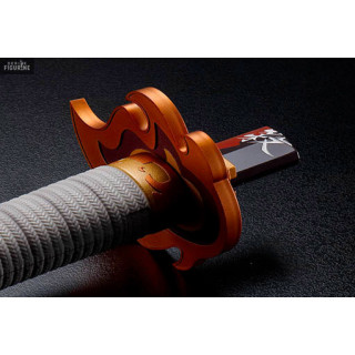 Figurine officielle de l'épée Rengoku Kyojuro mesurant environ 31 centimètres de long. Le fabricant est Bandai.