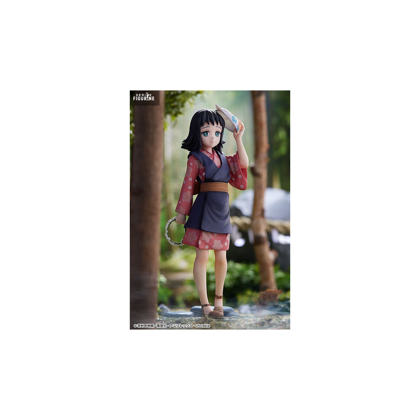 Réalisée en PVC, la figurine mesure environ 20 cm de haut. Makomo est sculptée vêtue de son kimono rose à motifs floraux, son tablier bleu marine, et sa ceinture marron. Elle tient son masque kitsune décoré de fleurs dans une main, et une couronne tressée de fleurs dans l’autre, renforçant son image douce et pure. Le socle représente un petit chemin en pierre, ajoutant une touche naturelle à la mise en scène.