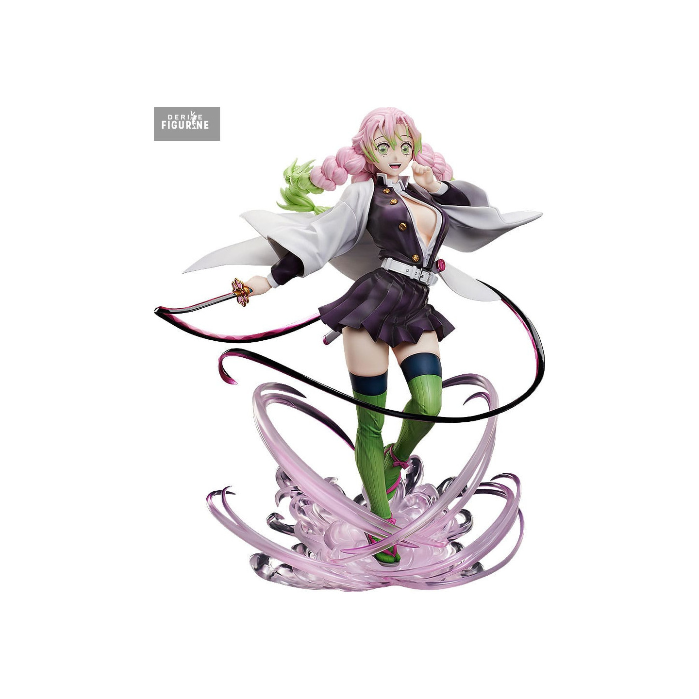 Mitsuri se tient sur un socle tourbillonnant de vagues translucides roses, évoquant son souffle de flamme d’amour. La lame de son Nichirin, subtilement teintée de tons cerise, est saisie en plein élan de frappe, soulignant la posture dynamique et l’équilibre parfait de la guerrière. Les textures soignées — plis du tissu, relief des bottes montantes vertes et nuances de rose dans les cheveux — témoignent d’un savoir-faire d’exception.