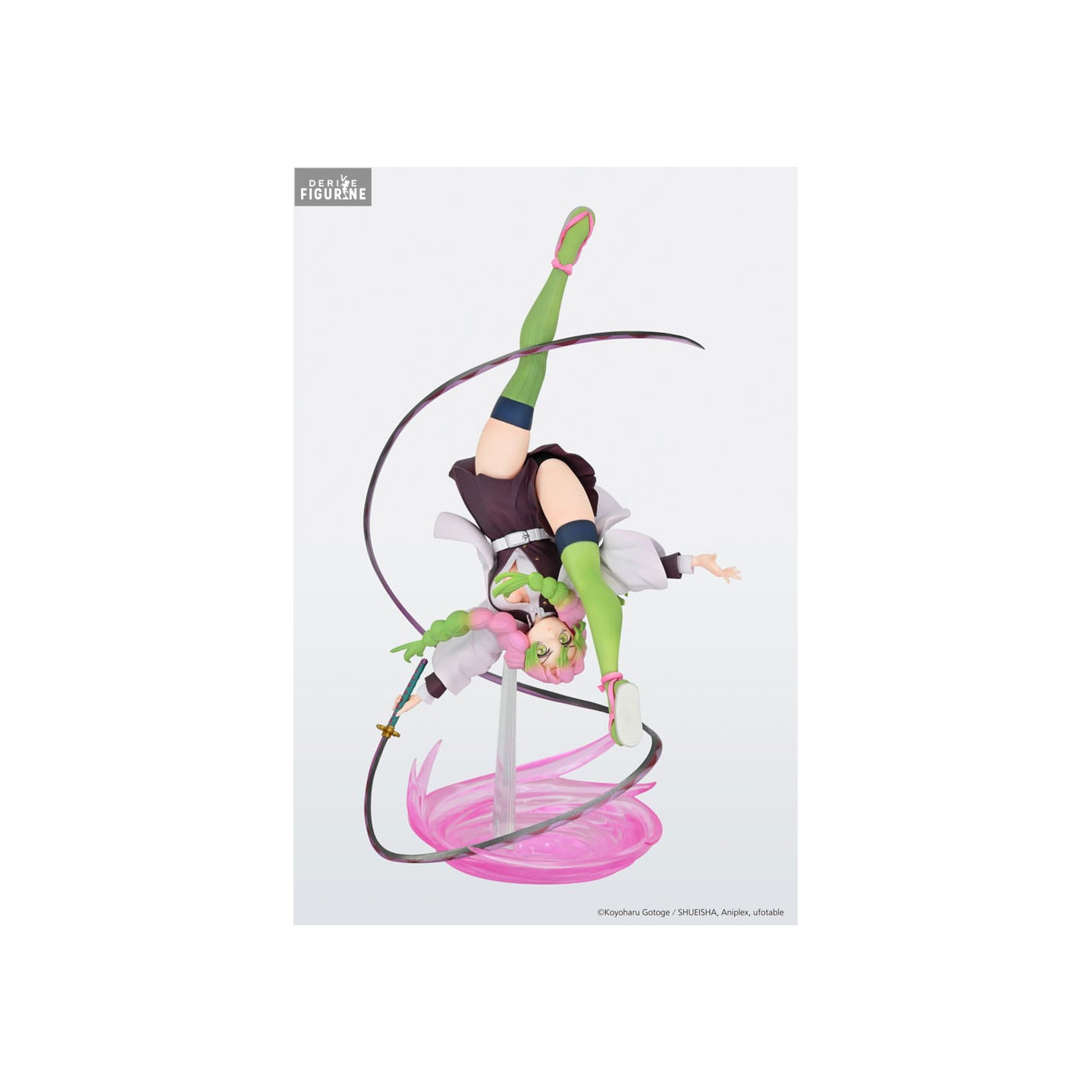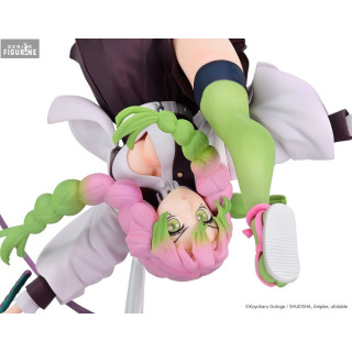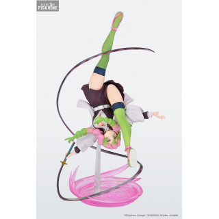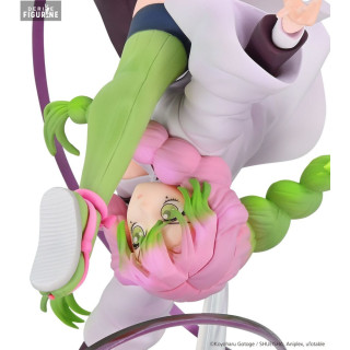 Le socle de la figurine est tout aussi impressionnant, représentant un tourbillon rose qui donne l'illusion de mouvement et de vitesse. Mitsuri tient son épée, prête à attaquer, avec une expression déterminée sur son visage. Les détails de son uniforme de chasseuse de démons, avec ses manches bouffantes et ses jambières vertes, sont minutieusement reproduits pour offrir une fidélité maximale à l'anime.
