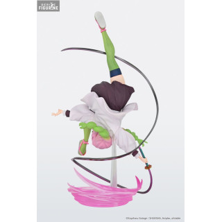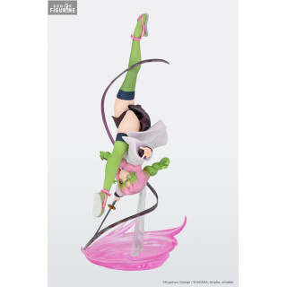 Cette figurine de Mitsuri Kanroji, mesurant environ 20 cm, est un véritable chef-d'œuvre de design et de dynamisme. Mitsuri est représentée en plein mouvement, exécutant une figure acrobatique avec une grâce inégalée. Sa chevelure rose et verte, caractéristique de son personnage, est sculptée avec soin, capturant le mouvement et la fluidité de ses mèches tressées.
