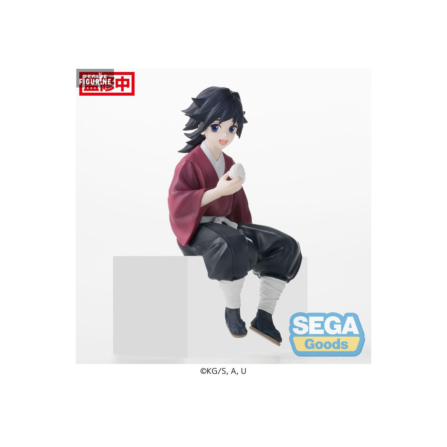 Giyu Tomioka, le Pilier de l'Eau, est représenté ici dans une pose assise décontractée, tenant un onigiri, ce qui ajoute une touche d'humanité et de simplicité à son personnage habituellement stoïque et sérieux. Vêtu de son kimono traditionnel rouge et noir, les détails de son costume sont finement reproduits, reflétant la précision et la qualité du travail de Sega. Le visage de Giyu, avec son expression calme et ses yeux perçants, est soigneusement sculpté pour capturer son essence tranquille mais déterminée.
