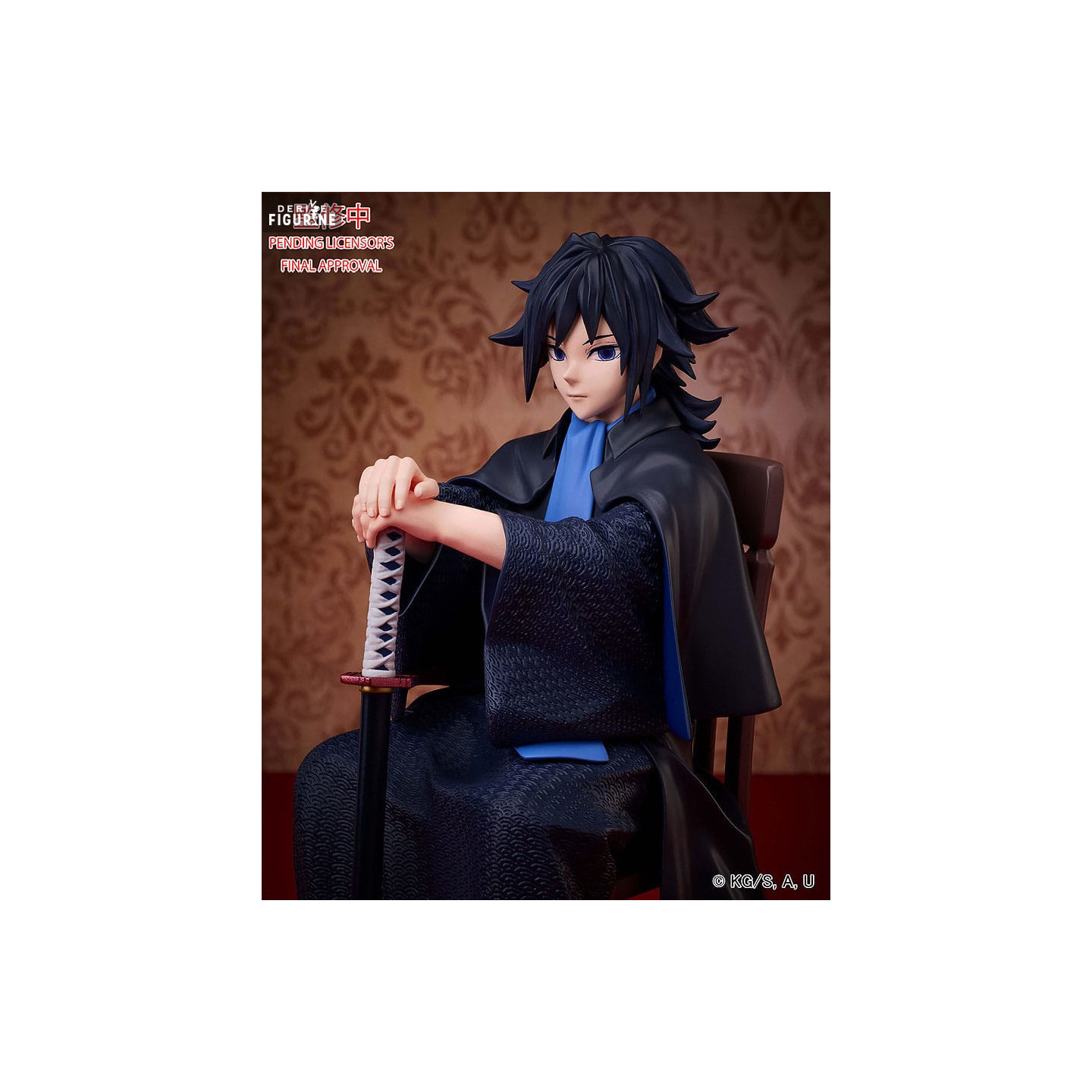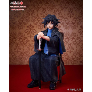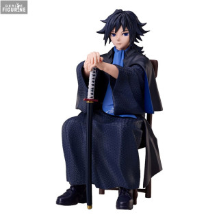 La figurine représente Giyu assis sur une chaise, dans une posture méditative et détendue, les mains posées sur son katana. Les détails de son costume sont minutieusement sculptés, avec des textures qui reproduisent le tissu et les motifs traditionnels. Son expression impassible et la manière dont il tient son sabre montrent la maîtrise et la sérénité qui le caractérisent, même dans les moments les plus critiques.